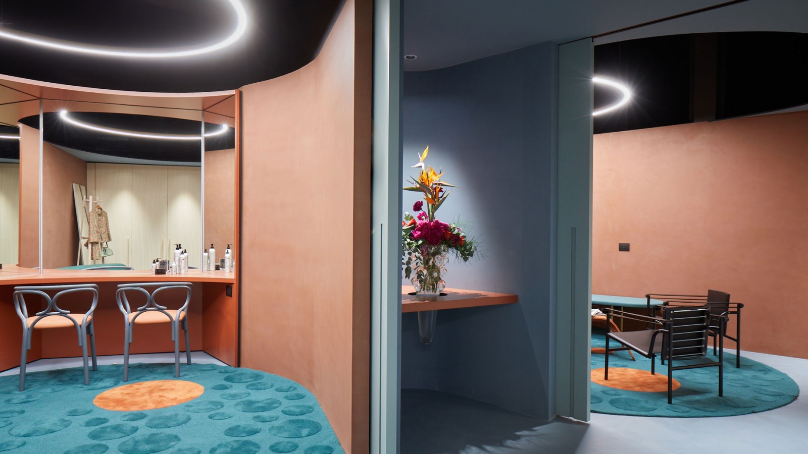Um diese Ruheoasen zu schaffen, beauftragte das Teatro degli Arcimboldi in Mailand Innenarchitekturbüros mit der Neugestaltung sämtlicher Umkleidekabinen. Der Garderobe der Stars, Primo Camerino genannt, nahm sich 2022 das italienische Studio Calvi Ceschia Viganò an.